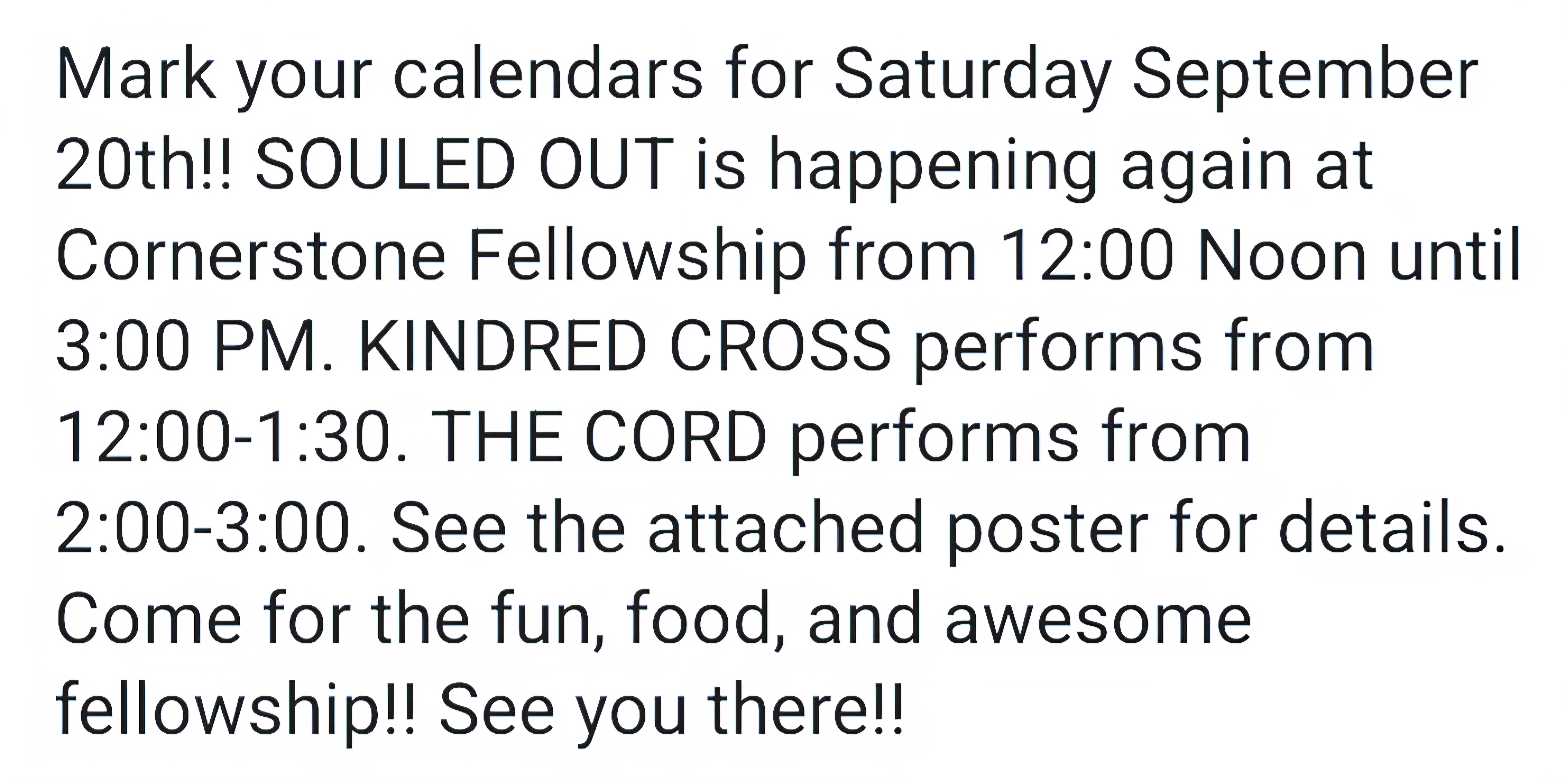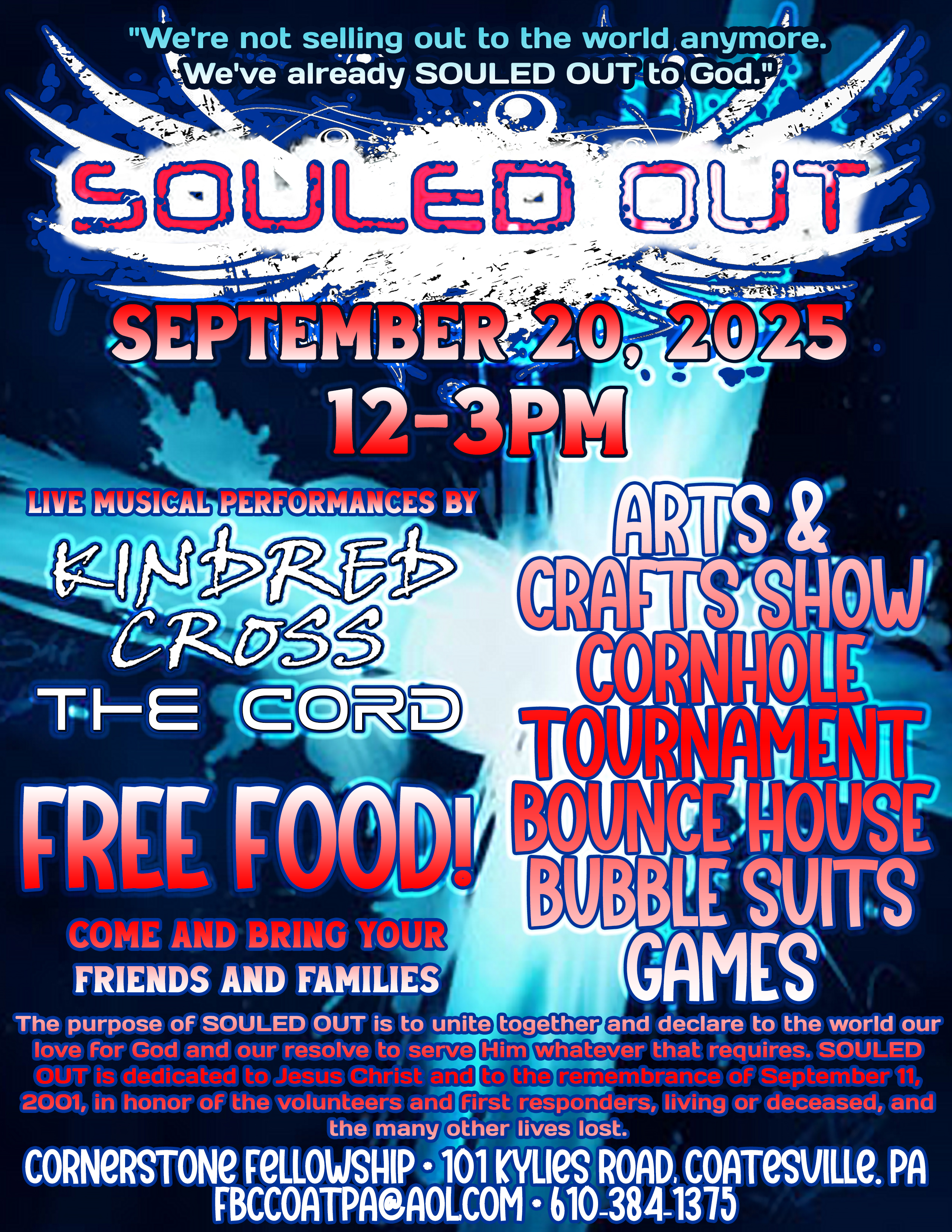 Souled Out Concert @ Cornerstone Fellowship 101 Kylie's Rd, Coatesvill PA 19320 Sept 20